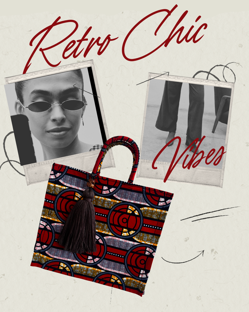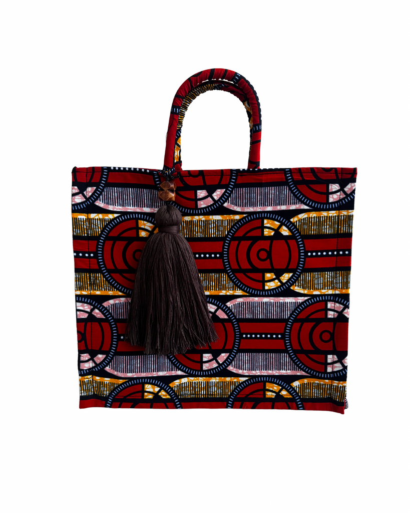 Make a statement with this bold, retro-inspired tote crafted from luxurious African wax fabric. The striking circular motif in rich tones of red, gold, and navy brings a touch of vintage glamour to a modern silhouette. Finished with a dramatic tassel and antique brass bead, it’s effortlessly chic — the perfect fusion of heritage and high style.