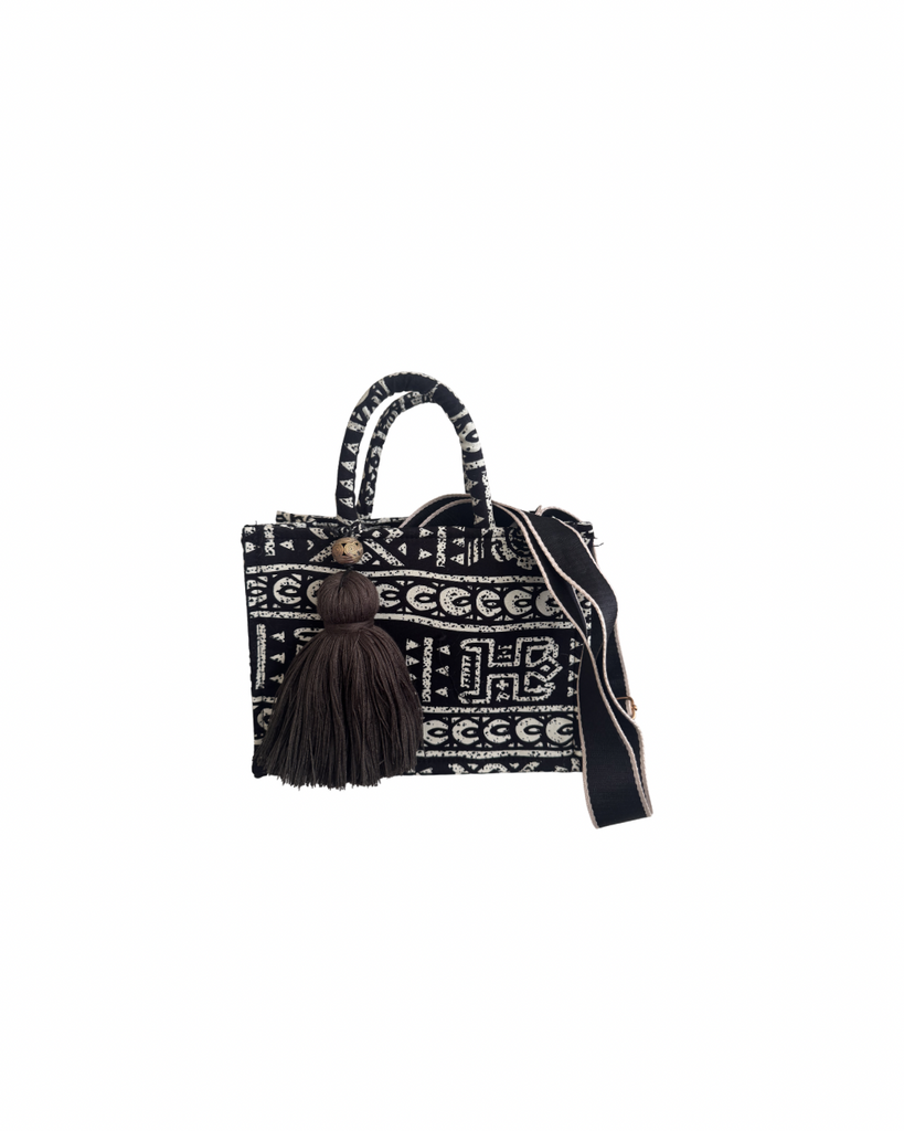 A small yet striking tote made from bold African wax print. With structured handles and an adjustable long strap, it moves easily from hand-held elegance to relaxed crossbody wear.