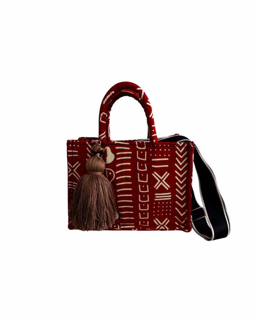 This is a stylish mini tote bag crafted from red clay colour African wax fabric with bold cream geometric patterns. It features soft rounded handles, a large statement tassel, and an adjustable black-and-white shoulder strap for versatile wear. A striking, compact piece — the Baby in our tote range.