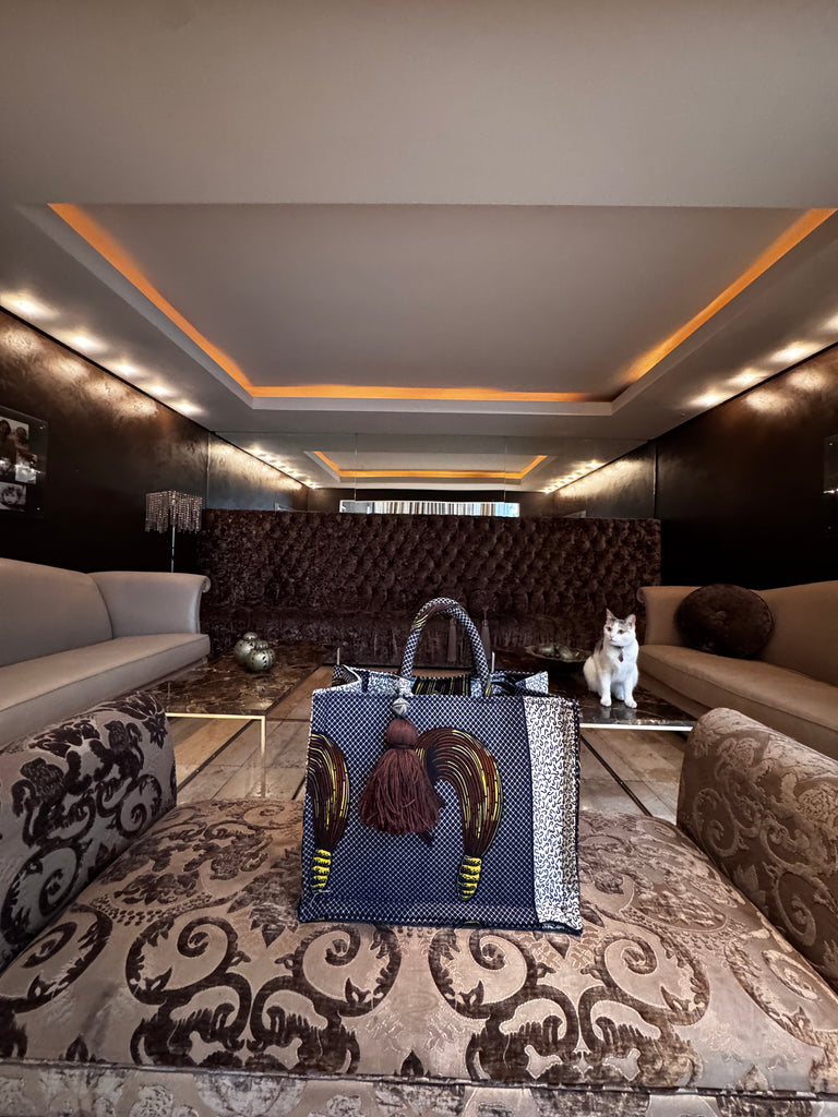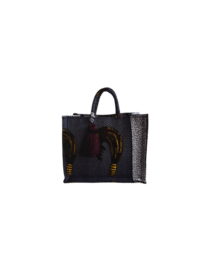 Chic tote in handmade African wax fabric featuring a bold broom motif, brown tassel, and short handles for effortless style.