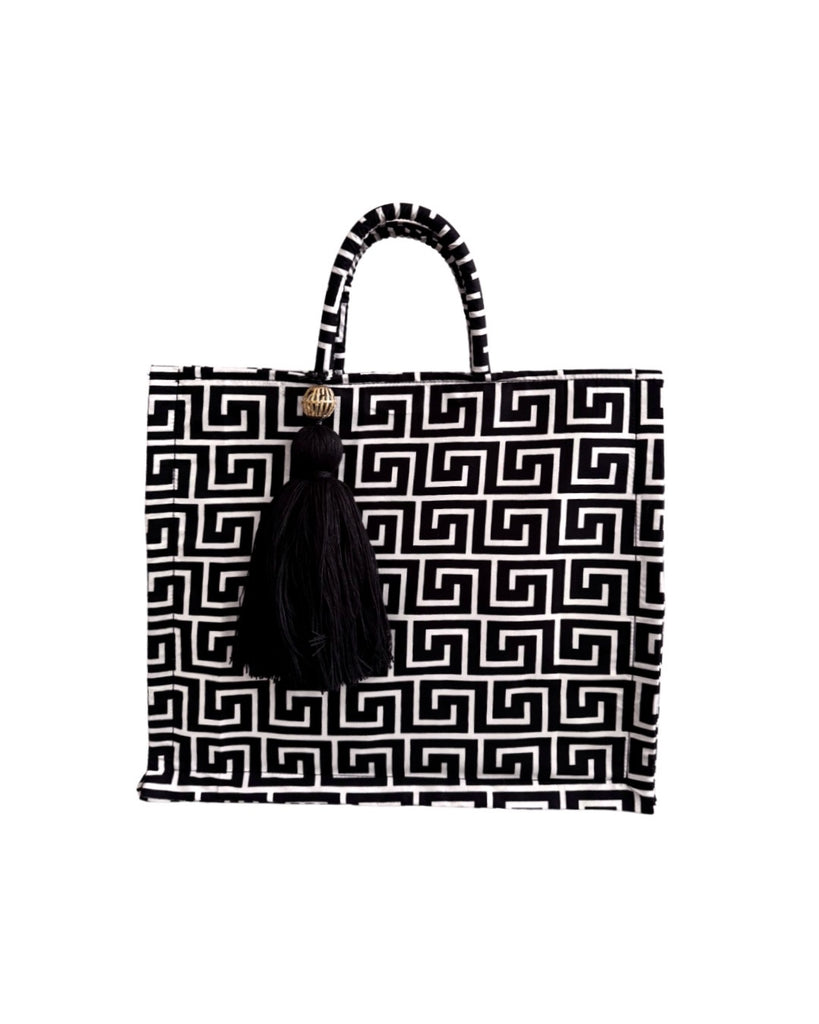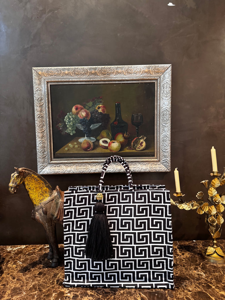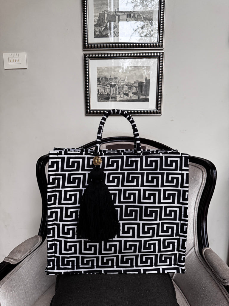 Elegant tote handcrafted from African wax print fabric in a timeless black-and-white geometric pattern. Featuring gracefully wrapped handles and a refined black tassel, it’s a sophisticated blend of culture and contemporary style.