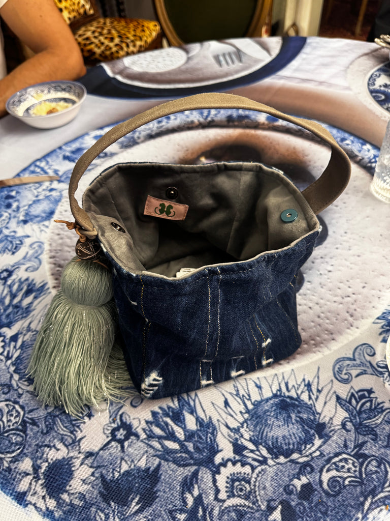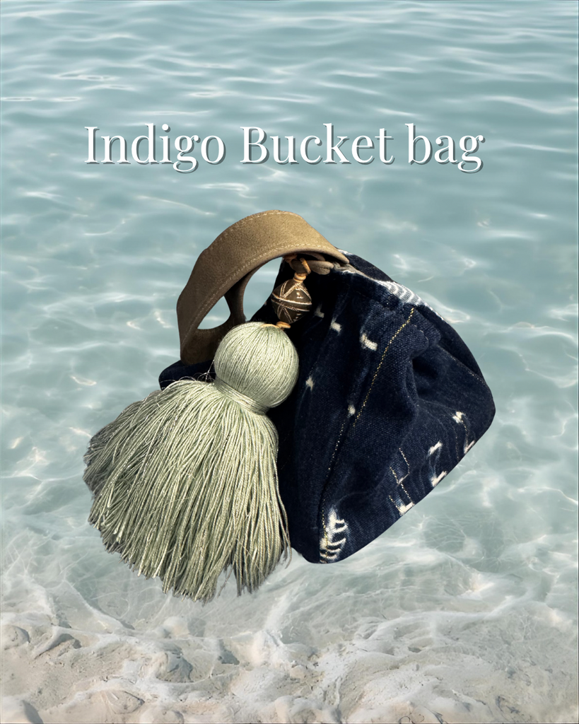 Bathed in ocean light, the Indigo Bucket Bag captures the effortless rhythm of island life. Crafted from handwoven indigo-dyed textile, and genuine leather handles it tells a story of tradition reimagined for the modern muse. The soft suede handle adds a touch of earthy luxury, while the oversized sage tassel dances with each step—an emblem of free-spirited elegance. Whether strolling seaside or city-bound, she’s your artful companion, quietly bold and irresistibly unique.