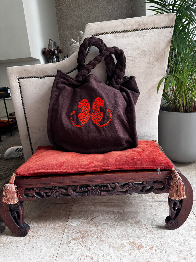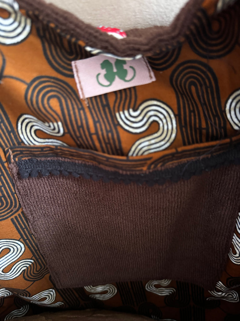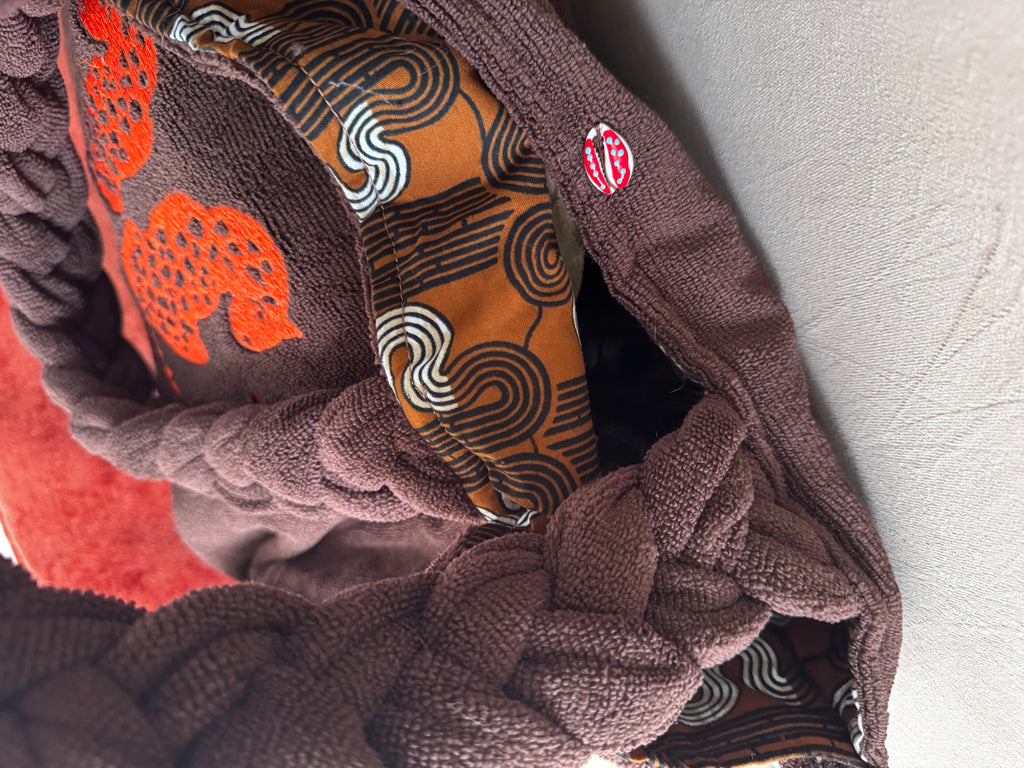 Luxurious brown towelling with large orange embroidery. Perfect for the beach! If you feel like being more bold we have you covered this bag is reversible. Reverse the bag to expose the beauty African wax in brown with a snake like motif of brown and white.